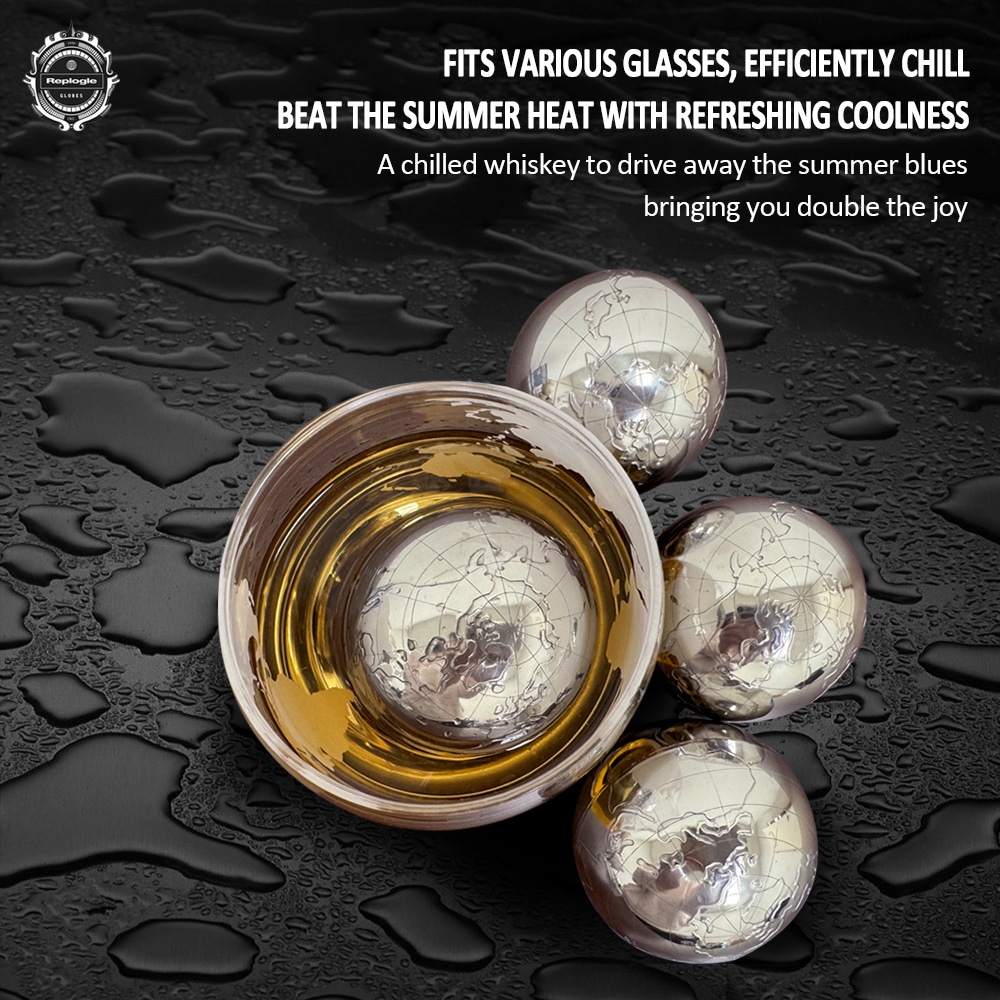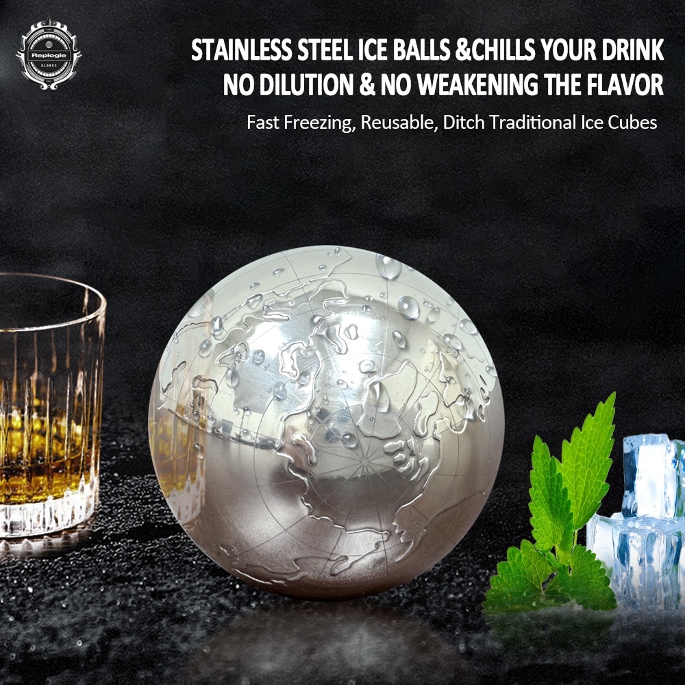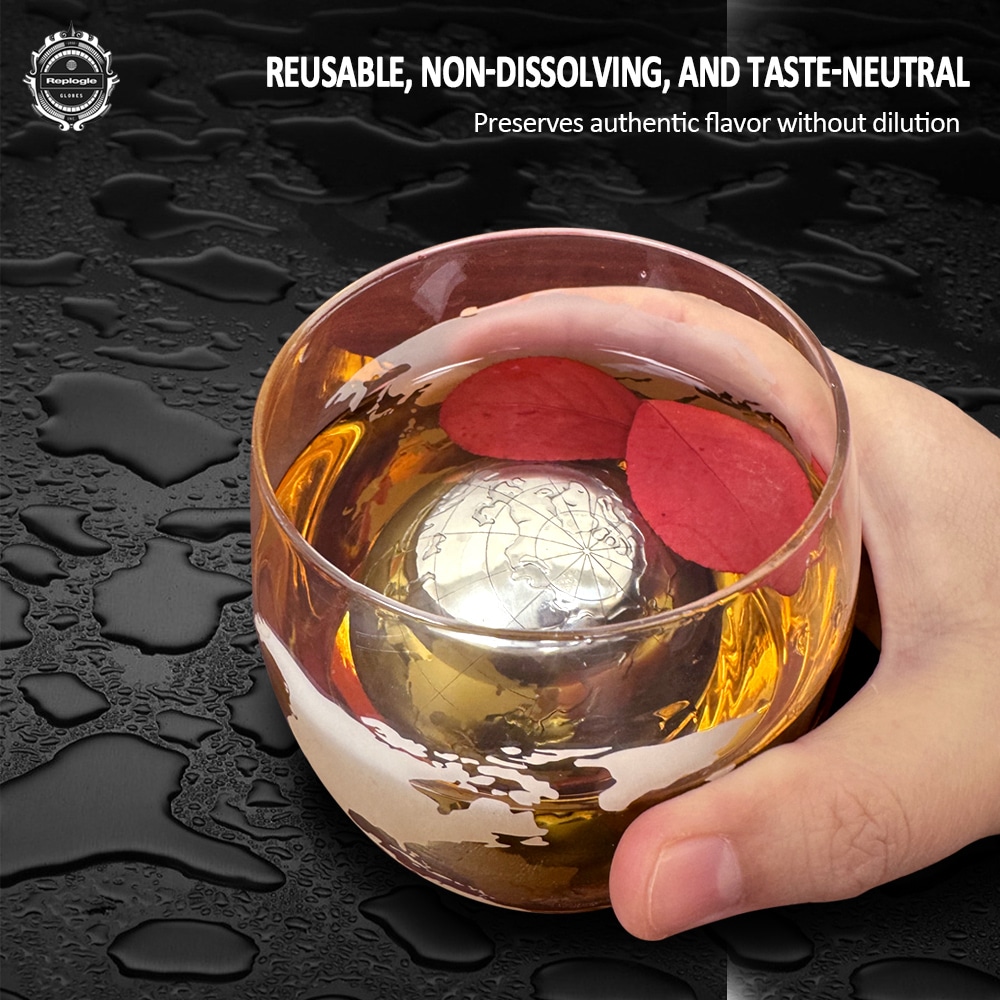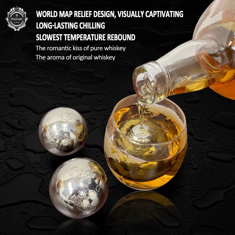 Stainless Steel Large Whisky Chilling Balls with Etched Globe Details. Chill Your Bourbon, Scotch, Whiskey, Old Fashion, Cocktails, with no Dilution, and no impurities. Premium bar Gift Box Set.