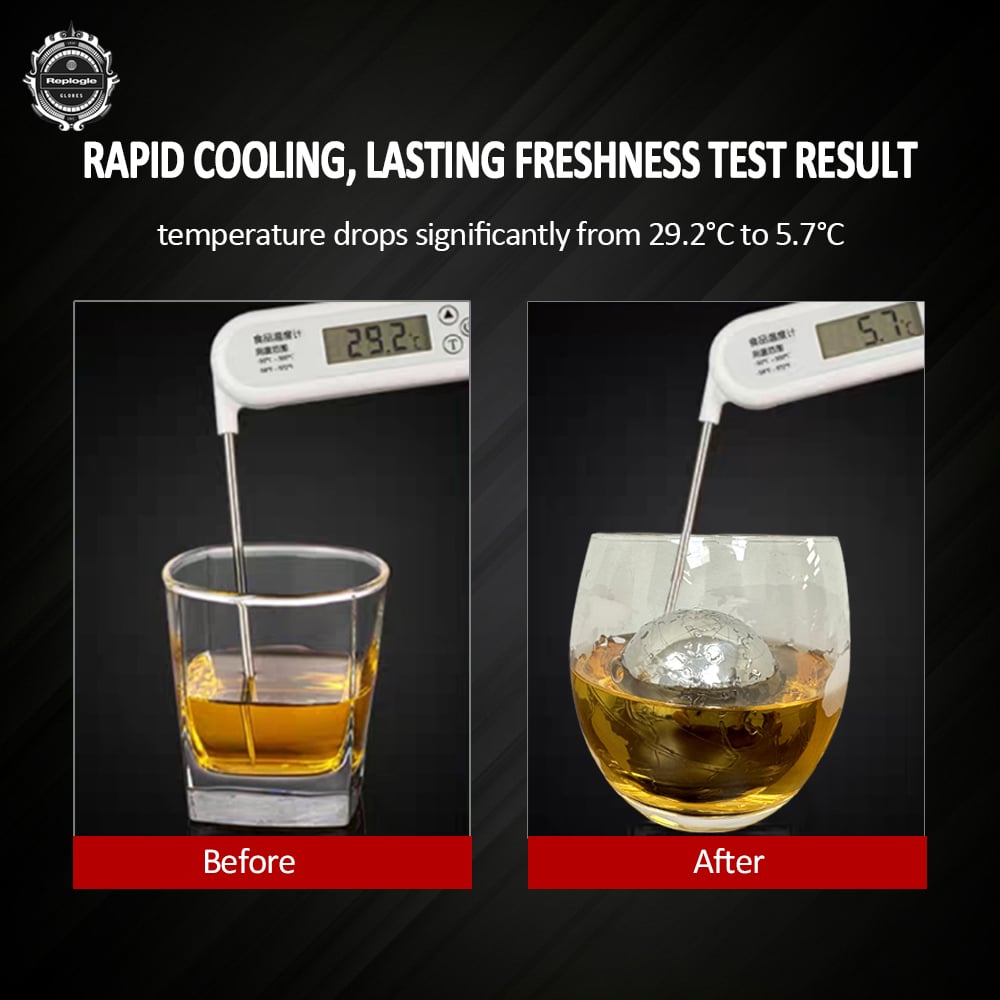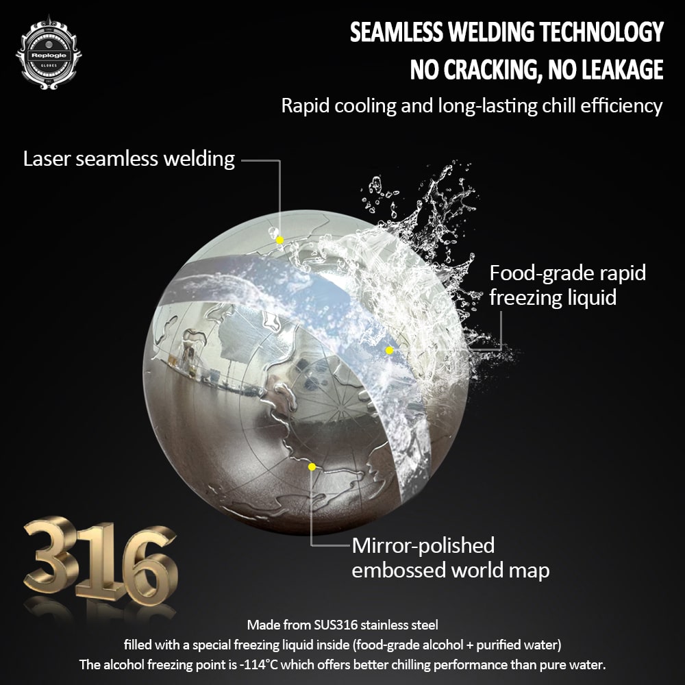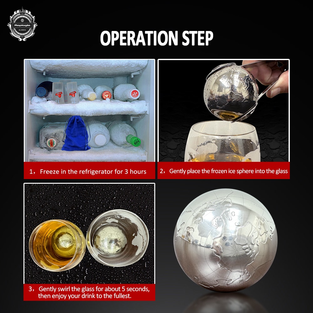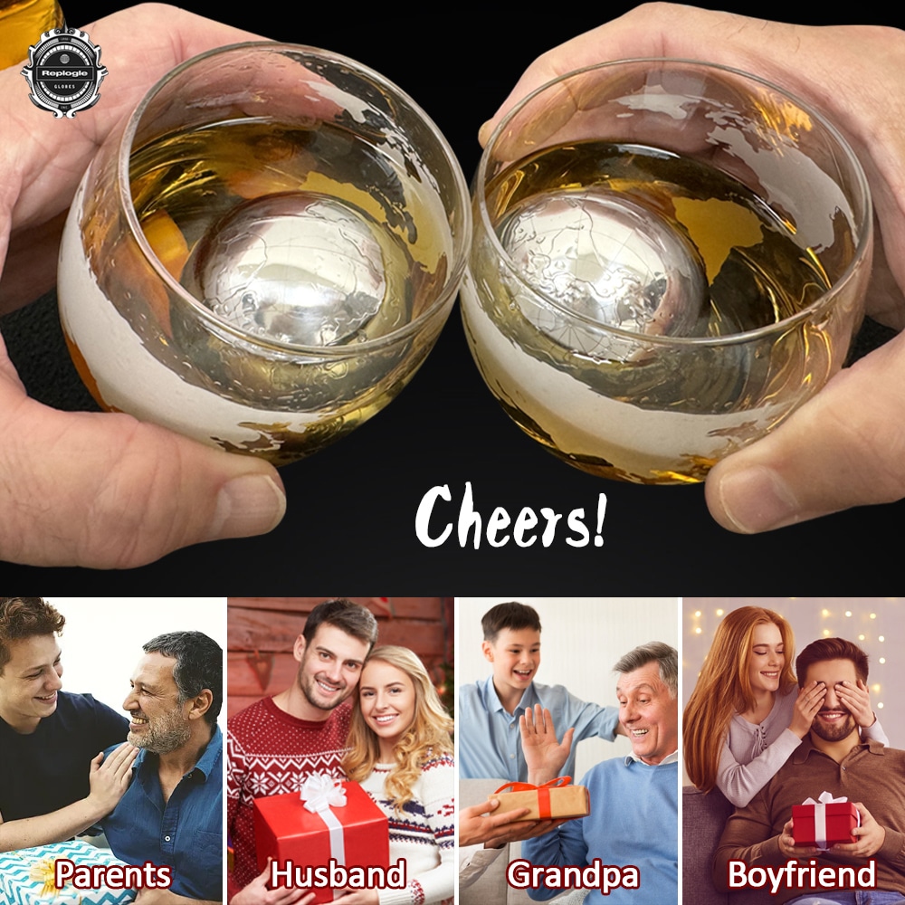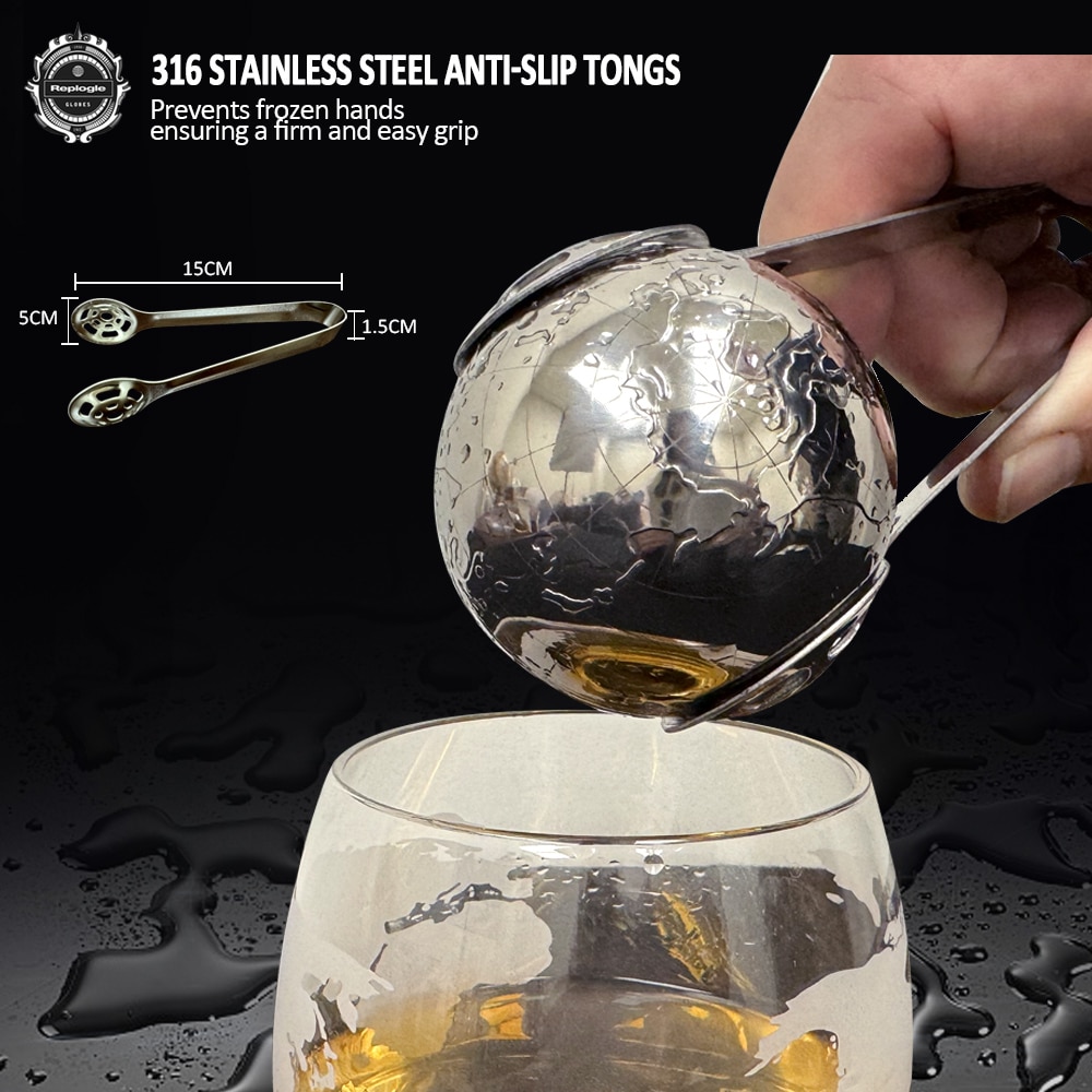 Stainless Steel Large Whisky Chilling Balls with Etched Globe Details. Chill Your Bourbon, Scotch, Whiskey, Old Fashion, Cocktails, with no Dilution, and no impurities. Premium bar Gift Box Set.